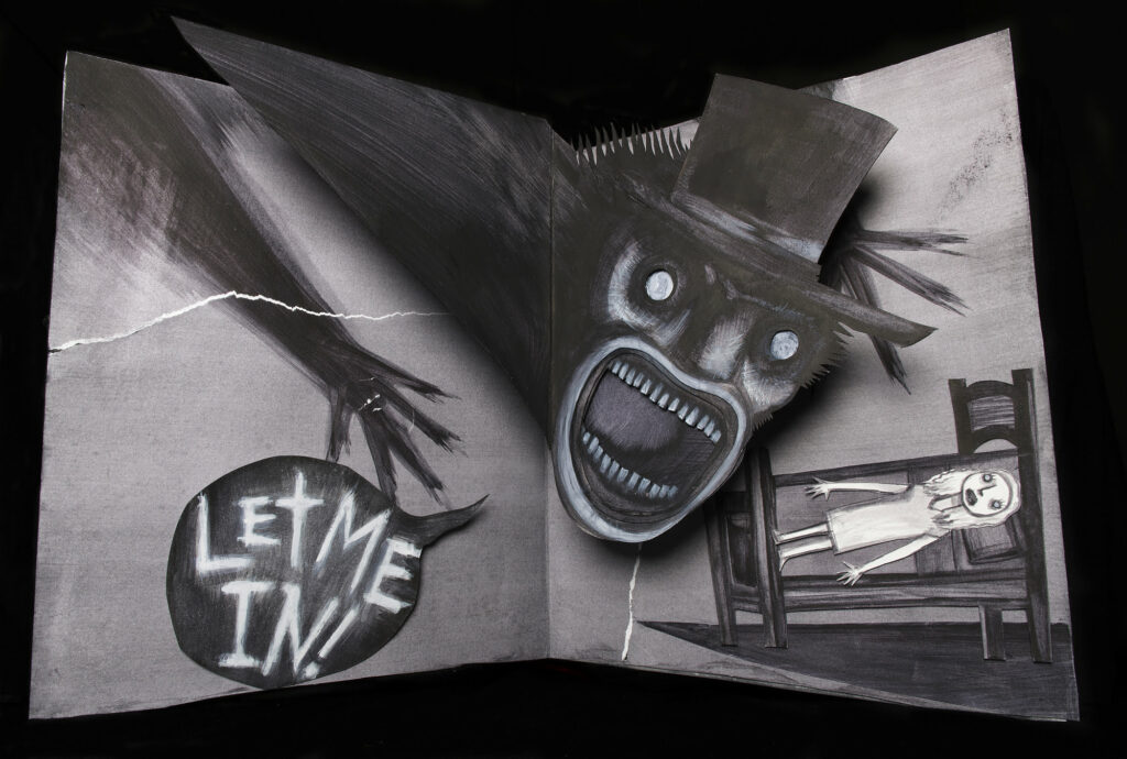 O livro torna-se culpado pelos problemas do menino. A mãe, em um momento de fúria, rasga a obra e a joga fora. Alguns dias depois, alguém bate na porta de casa e não há ninguém, somente o livro, que foi remendado, mas com as palavras das frases trocadas. Nele está escrito: “Quanto mais me evitar, mais forte vou ficar”. Além de um pedido para entrar e um aviso de que estava crescendo debaixo da sua pele. As ilustrações são macabras com imagens de uma mulher degolando um menino e essa mesma mulher se suicidando. Mesmo depois de queimar o livro, Amelia continua vendo e ouvindo Babadook por todos os lados.